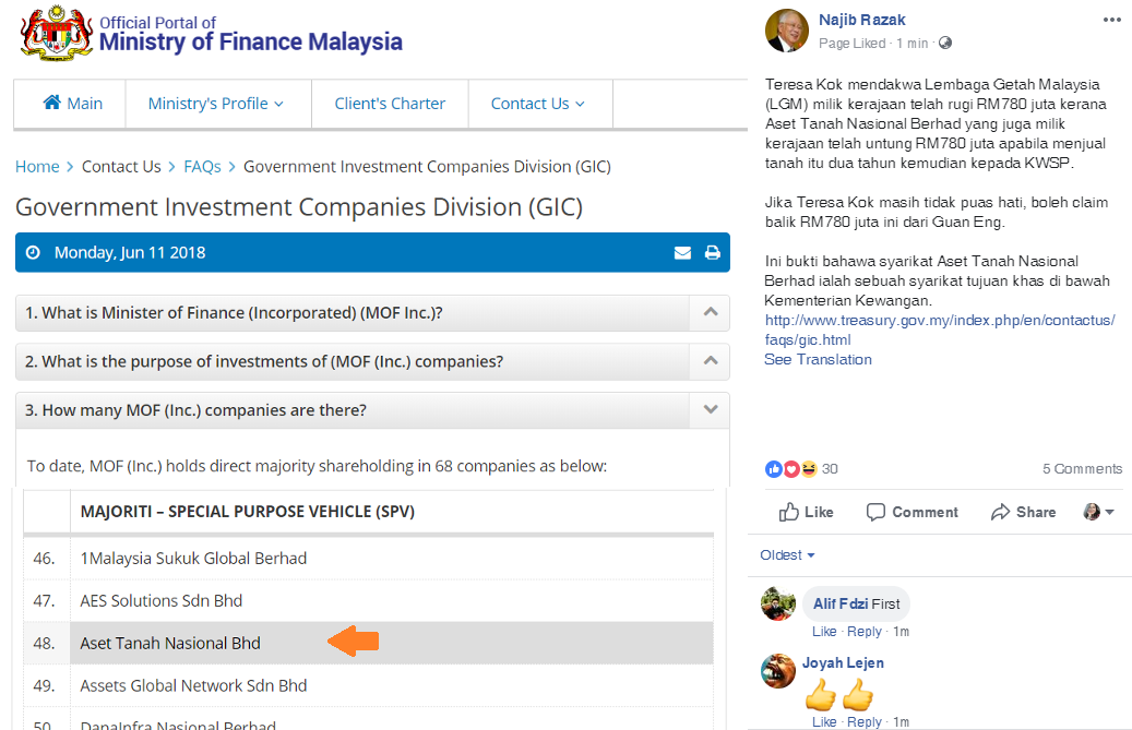 纳吉也在面子书上上载属于国家土地资产公司的证据,指有关公司是一间财政部属下的特殊项目公司。