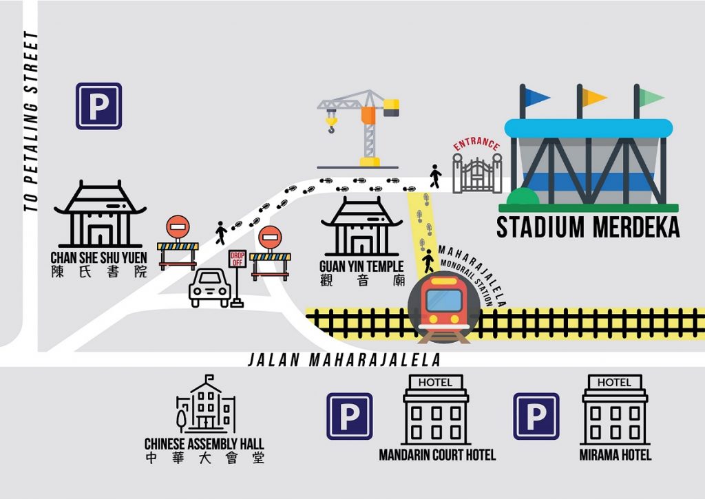 粉丝们可搭单轨火车(Monorail) 赴会,在玛哈拉惹利拉站 (Maharajalela KL Monorail Station)下车步行即可,或者选用捷运MRT,在默迪卡站(Merdeka MRT Station) 下车,往返默迪卡体育场只需步行1 分钟,更或者与朋友共车及其他共车交通。