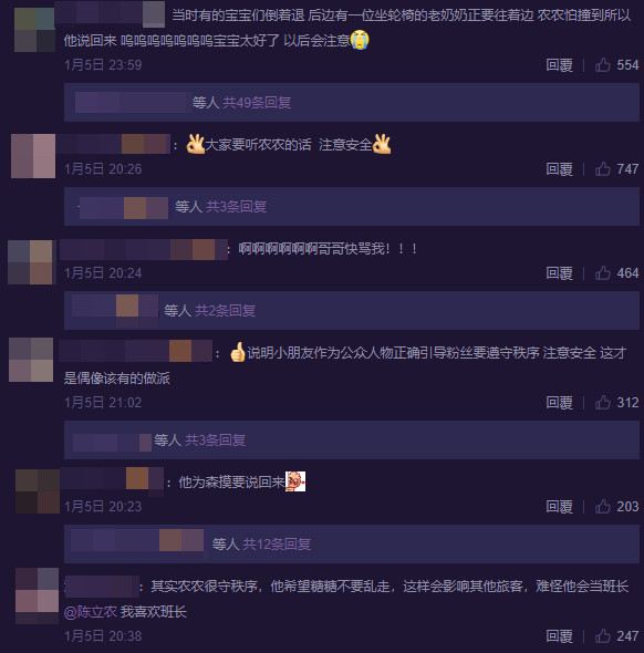 影片很短加上镜头受限,一开始网友不清楚到底发生了什么事,有粉丝还原现场状况,原来当时有粉丝一边拍陈立农,一边倒退着走,后方正好有一位坐轮椅的老奶奶经过,陈立农怕粉丝和老奶奶撞在一起,才会赶快出声提醒粉丝,网友对他的反应给予肯定:“公众人物正确引导粉丝要遵守秩序,这才是偶像该有的素养。”