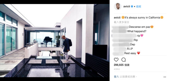 艾维奇死讯传出后,不少人涌入他的社交网站留言悼念,发现他最后一篇发文,是在16天前,当时的他疑似人在美国加州,享受着充满阳光的好天气,没想到这张照片,竟成为他离世之前的最后身影,令大票粉丝悲痛不已。