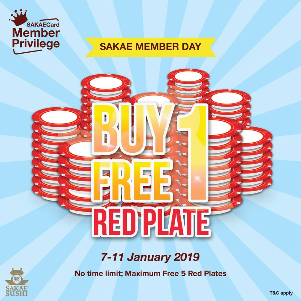 Sakae Sushi推出Buy 1 Free1特别促销! 8 Jan , 2019 | 吃喝玩乐 吃货们看这里!Sakae Sushi推出Buy 1 Free1特别促销! 从即日起至1月11日,Sakae Sushi将一连五天在全马分店推出Buy 1 Free1特别促销! 不过需要注意的是,这项促销仅限Sakae Sushi会员,而且只有红色碟子的寿司才可享有!每次消费最多只可享有5碟的免费寿司! 喜欢吃Sakae Sushi的朋友,可千万不要错过咯! 分享