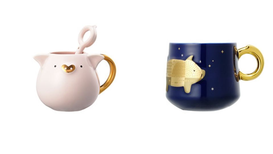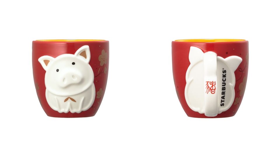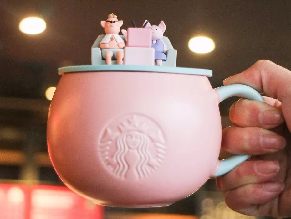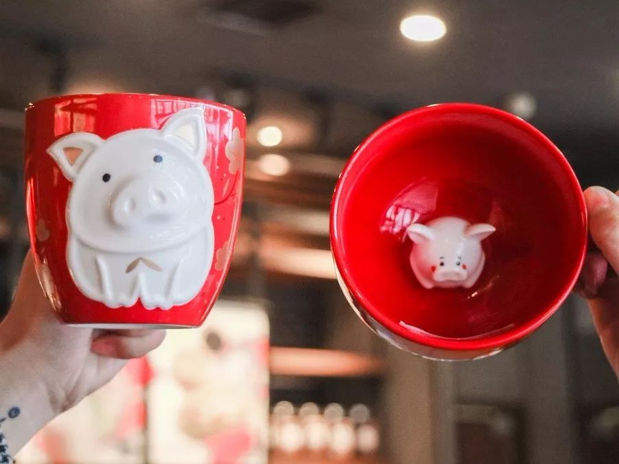 星巴克2019年推出的小猪系列商品,设计款式多样化!首先,第一款当然是充满喜庆的红色小猪啦!杯子的把手非常巧思的做成了小猪屁股,非常可爱!