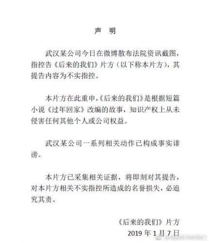 1月7日晚,电影《后来的我们》通过官方微博发表声明,否认涉嫌不正当竞争,称:“ 武汉某公司今日在微博散布法院资讯截图,指控告《后来的我们》片方(以下称本片方),其提告内容为不实指控。本片方在此重申,《后来的我们》是根据短篇小说《过年回家》改编的故事,知识产权上从未侵害任何其他个人或公司权益。”并将立即提告,写道:“武汉某公司一系列相关动作已构成事实诽谤。本片方已采集相关证据,将即刻对其提告,对本片方相关不实指控所造成的名誉损失,必追究其责。”
