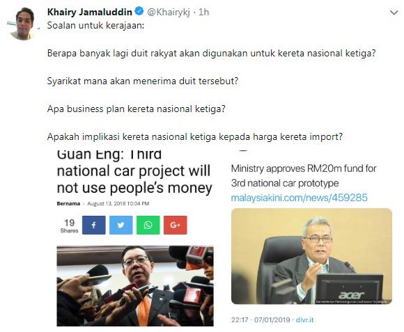 不过,莫哈末里祖安此番言论却遭到巫统林茂区国会议员凯里抨击,指究竟还会动用多少人民的钱在第三国产车。