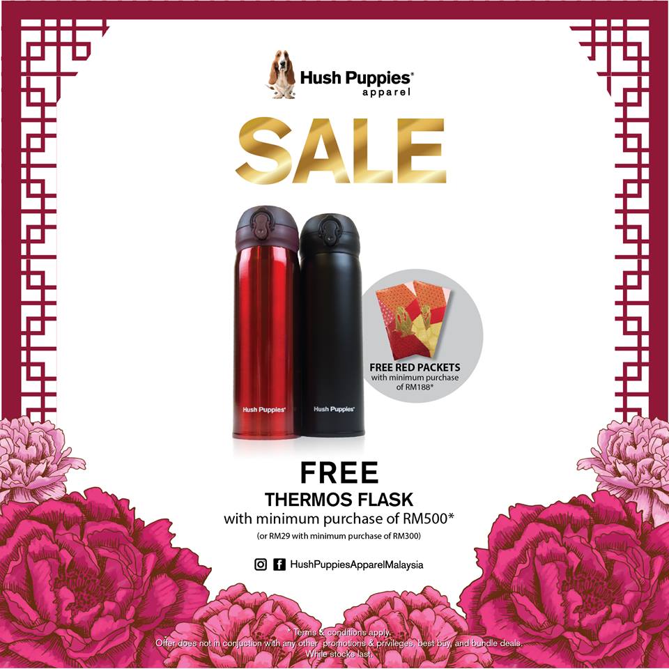 Hush Puppies也来送礼啦!你只要在店内消费满RM188,即可免费获得精美红包封!另外,Hush Puppies为欢庆新年,也特别推出限量版保温瓶!你只要消费满RM500或以上,就能免费获得!