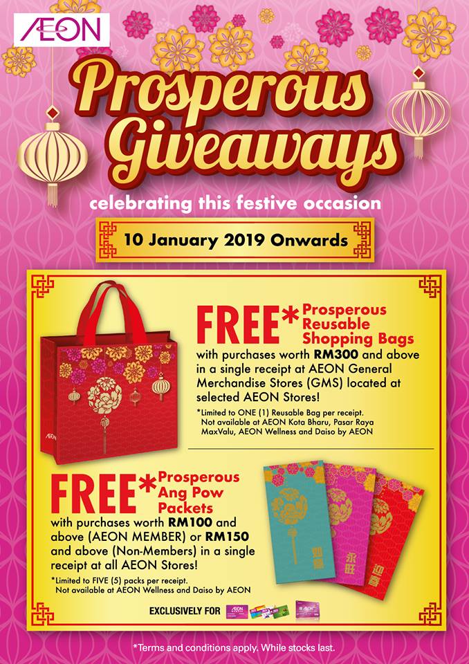 AEON会员只需消费满RM100即可获得限量版红包封,非会员需消费满RM150!每张收据最多只能获得5个红包封!
