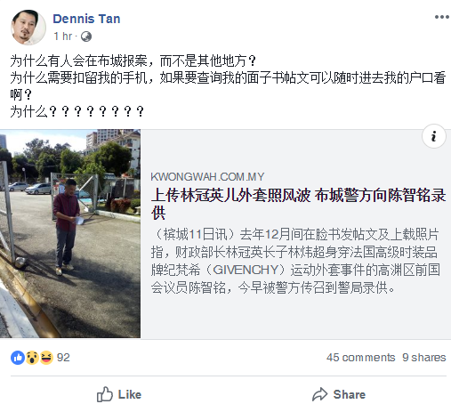 陈智铭指出,因有人到布城警局举报他上载财长儿子外套帖文,因此传召他录取口供的警员是来自布城。