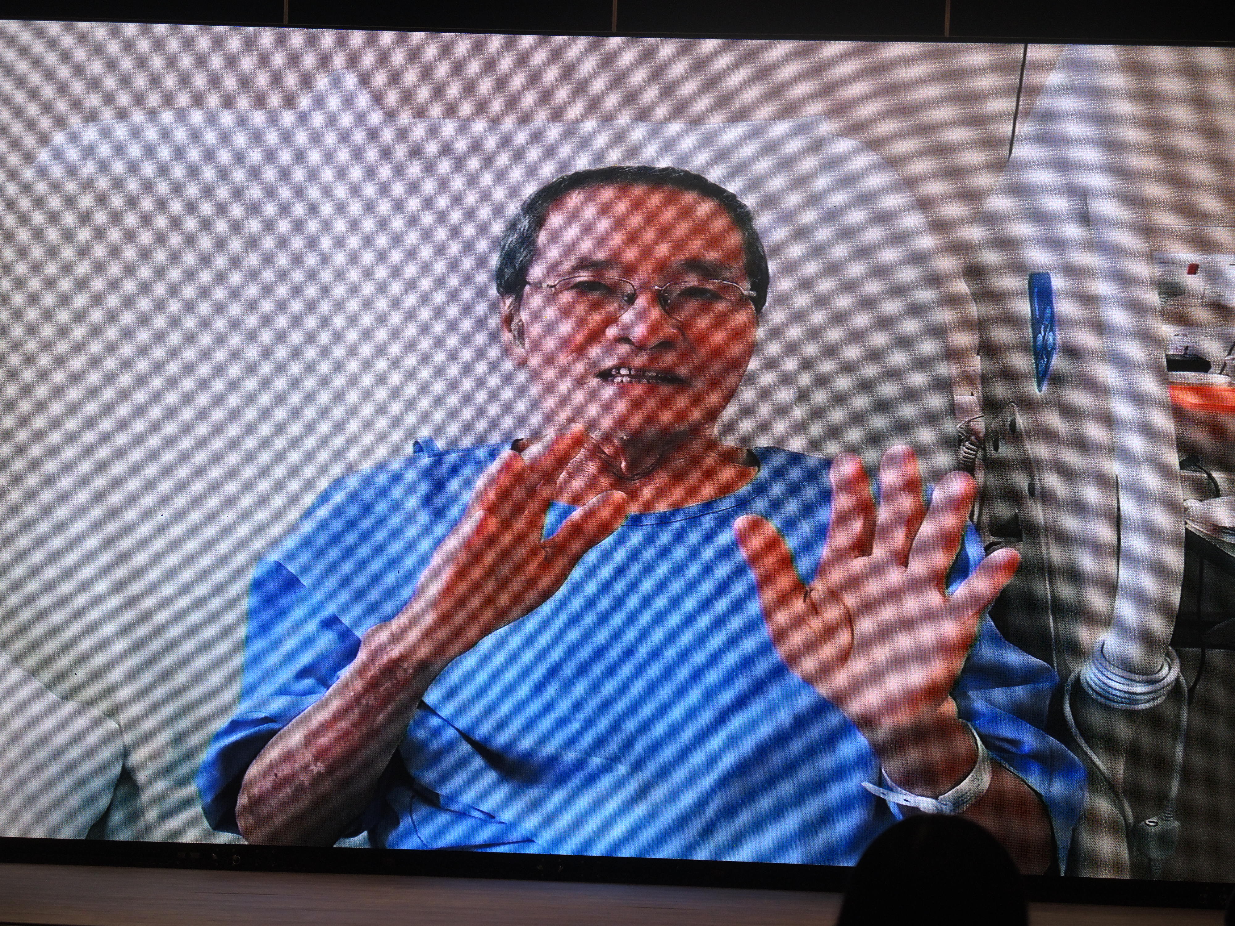 台上荧幕播放特辑期间,由其重现火灾发生事故现场,媒体留意到林德荣、导演和梁祖仪等人忍不住飙泪。另外,也播了目前仍在医院观察的叶清方说话影片,明显可见其手臂上的疤痕。根据林德荣表示,方叔从事发至今住院整3个月半了,原他想向医院申请方叔出席此午宴,但方叔拒绝了,“他很不好意思说要坐轮椅很麻烦,也怕影响大家的情绪,但他很正能量!”他叙说,目前方叔的脸和手已经完全复原,剩下脚踝有一寸的小伤口,“因常走动的部位所以比较难恢复。”