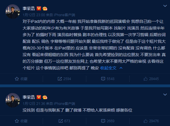 不过,李荣浩透露,其中的资料,是处于非常初期的阶段,连配音、调色都没有,看起来十分粗糙。文中,他也解释,自己为何要把这件事说出来:“首先希望捡到的这位朋友,不要发出来,真的万分感激,但万一这位朋友发在网上,也希望大家不要用太严格的审视去看待这个短片,这个事情就这样吧,都别再提了,晚安。”