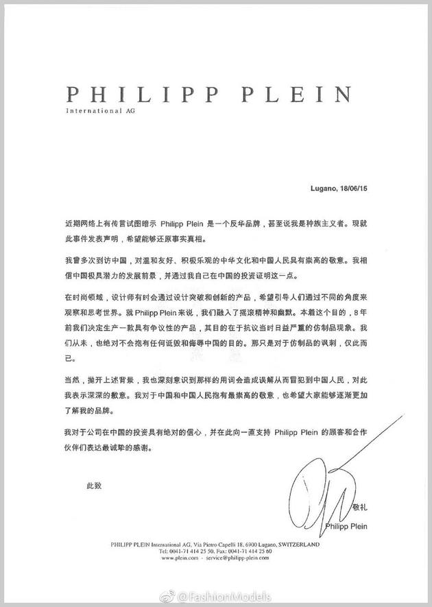 据悉,该时装品牌曾公开发售一款印着“FUCK YOU CHINA”字样的T恤,袖口部分也绣有滑稽的清朝小人。该事件在品牌进军中国市场后引发轩然大波,品牌迫于压力不得不出面致歉。但在道歉信的落款部分,则被设计成了一个下跪的清朝辫子头。
