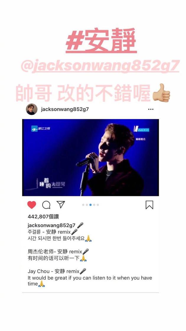 王嘉尔微博分享其在《梦想的声音》中演唱《安静》的视频一则,并隔空喊话周杰伦:“周杰伦老师,安静remix,有时间的话可以听一下。”虚心求教的他也得到了周杰伦在某社交平台上的亲自回复,赞道“帅哥,改的(得)不错哦!”
