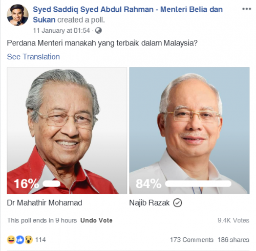 有关投票截止目前为止,纳吉以84%支持率领先,而马哈迪才获得区区16%的人支持。