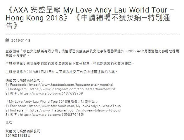 刘德华申请红馆补场开唱失败 预估损失超过千万 19 Jan , 2019 | 娱乐前线 刘德华去年跨年演唱会因嗓子问题腰斩,继而取消余下共7场演唱会,他一心想要今年年底补场开唱,怎知刘德华官网发特别通告,指申请补场不被接纳,大会将于本月31日在几个平台公布退票退款的方案。这次申请失败,以他的歌酬、制作费、乐手、dancers、场租等等,估计刘德华损失超过千万。 去年跨年演唱会,刘德华唱到第14场因为嗓子问题腰斩,之后他确诊流感,最终宣布取消余下共7场演唱会。之前主办单位宣布会申请今年12月档期,如成功申请便可以作补场演出,不过现在补场失败已成定局,刘德华损失惨重。 刘德华官网截图 分享