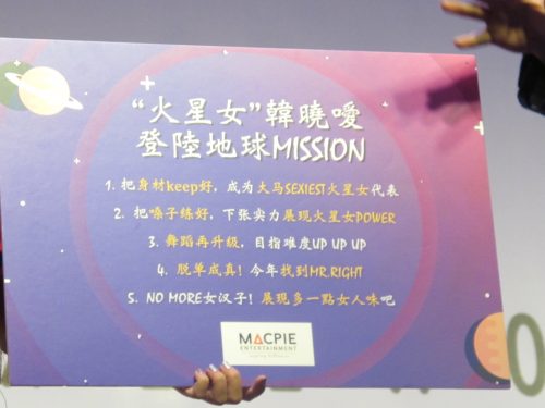 正式出道成为歌坛新人的韩晓嗳超级紧张,见到现场观众座无虚席她还一度惊讶表示以为没有人会来,但见到家人朋友都到场支持让她非常开心,当主持人开始问第一道问题时,她紧张到说:“我不知道要怎样回答”。