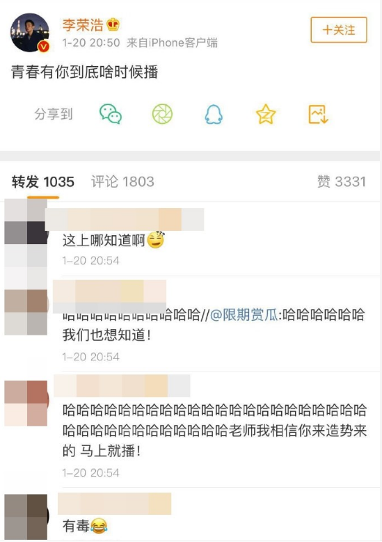 “偶练第二季”《青春有你》18日突然宣布停播,让观众期待陷入煎熬。就在停播内幕、何时再播出等成为网络最热谣言时,连担任导师的李荣浩都发文询问播出日期,惹网友笑翻。