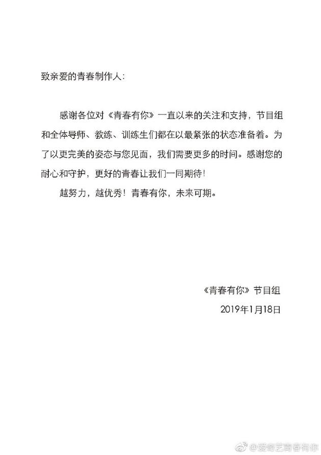 《青春有你》号召两岸三地100多位新人男偶像同台竞争,除了继续请张艺兴担任召集人,并邀请天后蔡依林、李荣浩、徐明浩、欧阳靖、爱福杰尼等人担任导师。如今节目单位发公告暂停播出,外传原因是粉丝投票、淘汰制度没有通过审查,更有人质疑是总局最新限令“男艺人禁戴耳钉(环)”,导致节目画面需要后制修片,到目前为止,该节目播出时间仍尚未公布。