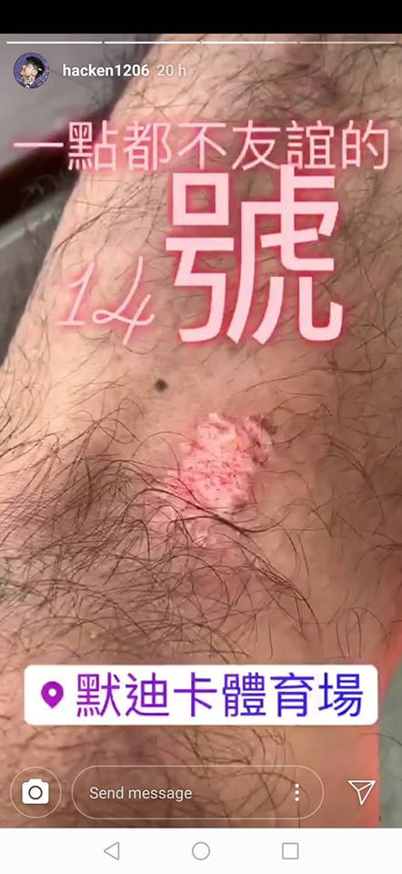 李克勤膝盖部位被踢到轻伤脱皮,但看起来觉得好痛(腿毛也太浓密XD)!