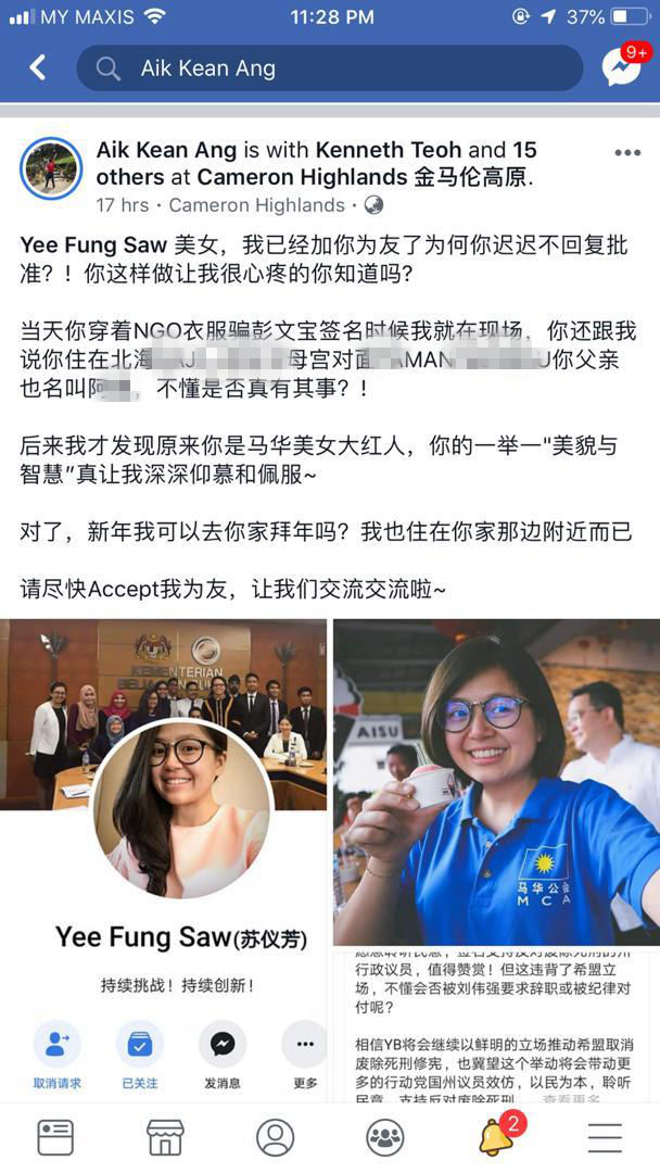 “两天后,洪翊谦就在面子书上发了一个帖文,指已加我面子书,为何我还不批准、他感到很心疼,还说出我家的地址和父亲名字,等等。”
