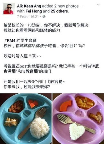 随后于2017年头,洪翊谦再次在自己面子书户口上载由政府津贴的免费餐,误导网友槟城某间校食堂售卖的4令吉营养餐,为政府所津贴的2令吉50仙免费餐。