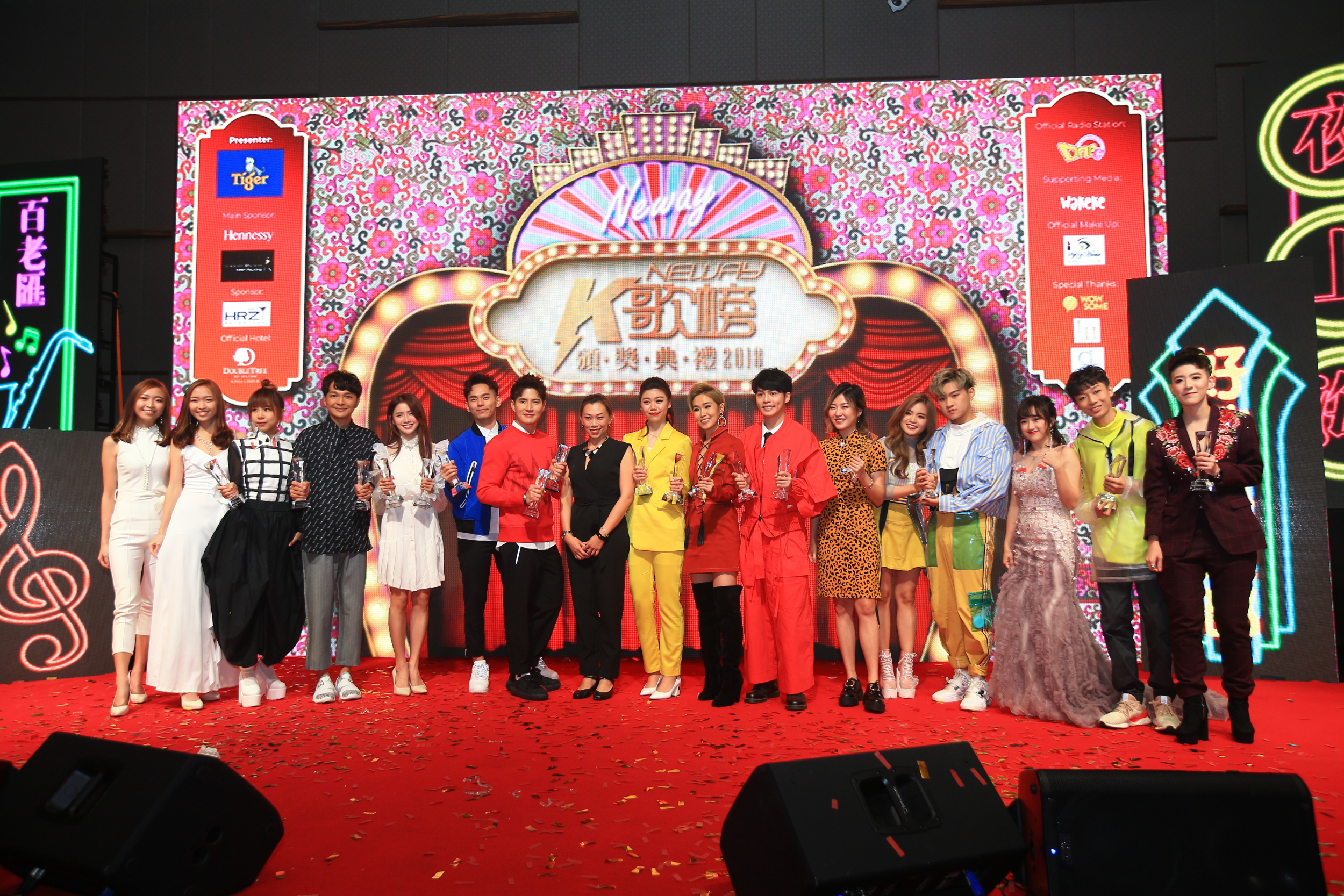 一年一度的《Neway K歌榜颁奖典礼2018》在今年已经来到第六届,颁奖典礼上一共颁发13项奖项28个奖座,今年的主题是“上海之夜”,因此出席的歌手艺人都应主题盛装打扮出席包括:Fuying & Sam 、Bell宇田、 蔡恩语、 Victor李俊颉 、Jyin傅健颖、Joey 蔡卓宜、Danny许佳麟、赖淞凤、碰碰姐弟、李佩玲、Ruby狄妃、Ribbon黄若熙、Bryson 刘铠翔、YBB杨宝贝、“车子”车志立、Pink陈珂冰、林可欣、Gary徐梽豪及One FM DJ:Angeline 、Hana 、Adrian 、Dino。