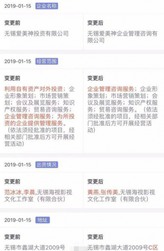 李晨退出与范冰冰合资公司 新合伙人是她! 28 Jan , 2019 | 娱乐前线 有网友发现,在范冰冰税务问题曝光之后,李晨已经退出了与范冰冰的合资公司——曾估值7.4亿元的无锡爱美神影视文化有限公司,范冰冰母亲张传美成了新合伙人之一,同时该公司的法人也不再是范冰冰,股东也发生了变化。 据悉,范冰冰与李晨恋情公开后,2015年11月,李晨、范冰冰合资成立爱美神企业管理咨询有限公司(以下简称“爱美神企业管理”)。到了2018年4月,无锡海视影视文化工作室(有限合伙)加入,爱美神企业管理的法定代表人和负责人由李晨变更为牟恩广。但在今年1月15日,李晨退出了爱美神企业管理。 分享
