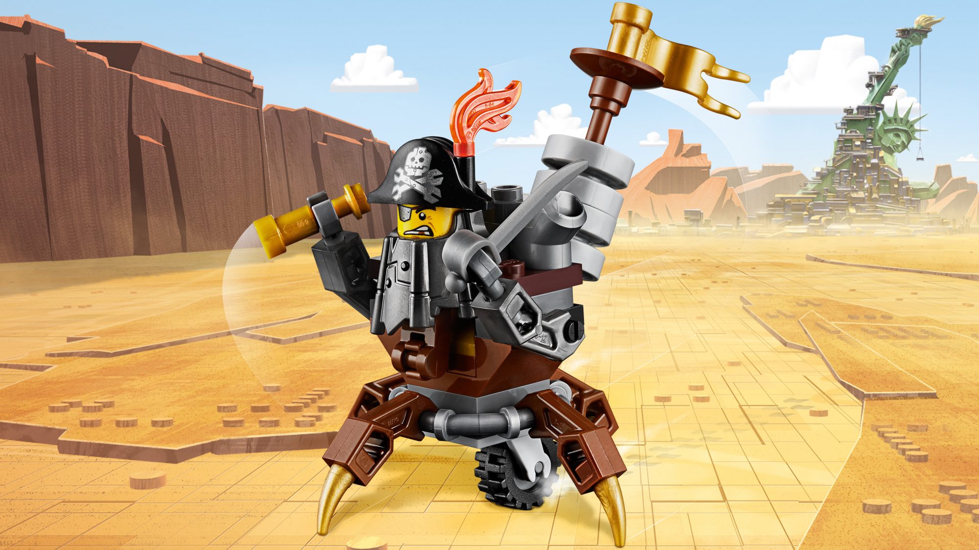 该套装包括一个Apocalypse-borg Benny 迷你公仔,Sweet Mayhem迷你娃娃,以及一个可依附在迷你公仔身上以乐高砖砌的星形模型。 MetalBeard的重金属三轮车具有内置的MetalBeard迷你公仔头部,带有两个可调节射击炮的旋转炮塔,带有咬合钳的可调节鲨鱼射击器,乌鸦巢,旗帜和三个橡胶轮胎的轮子,也包括一个巨大的前轮。