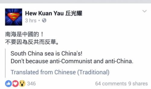 他今日在其面子书贴文表示,他曾在2016年7月南海课题上发表“南中国海是属于中国的”引起民众争议,但他今日作为效忠国家的公民,他选择撤回这句话。