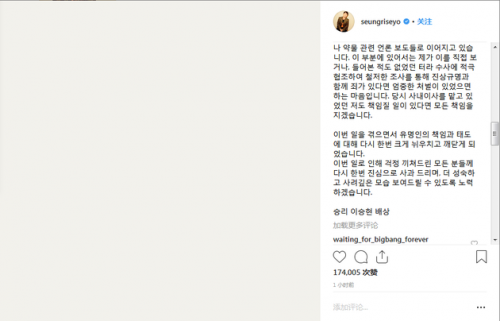 因为暴力事件而引发的毒品和药物相关的报道层出不穷并成为焦点。关于这部分,我并没有亲自看到的或是听到的相关内容,所以只能积极的配合调查,通过彻底的调查查明事实真相后,如果有罪我认为应该进行严厉的惩罚。而当时作为社内理事的我,如果有需要负责任的部分我也一定会负起全部的责任。通过这次的事情,我再次深深的反省也领悟了作为有名人士的责任和态度。再次向因为这次的事情而担心的所有人表示真心的歉意,会努力展现更成熟更深思熟虑的样子给大家。