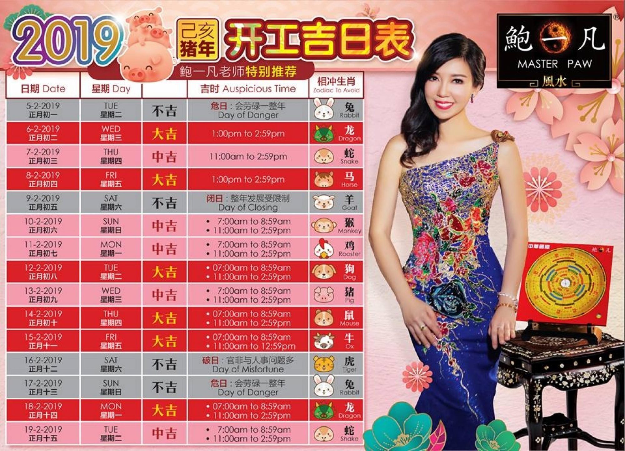 2019年开工吉日表 选对吉日猪年发大财 8 Feb , 2019 | 吃喝玩乐 想要在猪年工作顺利、财源滚滚?那就要选好日子和时辰开工啦! 正所谓一年之计在于春,无论你是自雇人士、老板或打工仔都需要留意!选对了开工吉日时辰,将有助于你在2019年获得好财运、好运势哦! 这里是鲍一凡老师为大家列出的2019年开工吉日表!不同的生肖,开工日都会不一样,大家可以注意一下! 分享