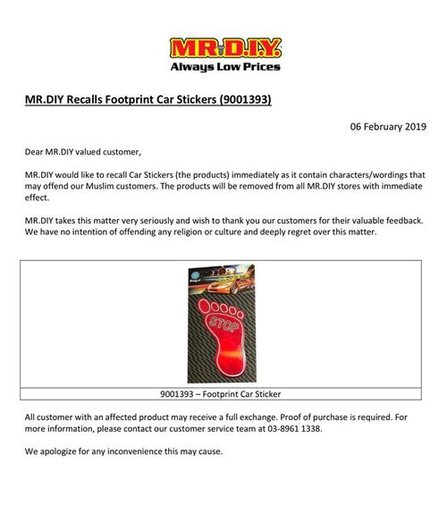 (吉隆坡8日讯)随着有网民指我国著名连锁店MR. D.I.Y.出售的脚印汽车贴纸印有侵犯穆斯林字眼,该公司宣布,即日起召回该店出售的相关产品,并在全国分店全面下架有关产品。