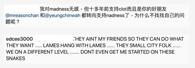 之后有网友留言表示自己不是支持余的品牌,但十年前支持陈冠希的杨千嬅比陈冠希都转去支持余文乐,并问陈冠希:“为什么不找自己的问题呢?”这句话令陈冠希马上再发火,表明杨千嬅和陈奕迅不是他的朋友外,又称他们阴险:“DONT EVEN GET ME STARTED ON THESESNAKES!(不要把这些阴险小人跟我扯上关系!)”