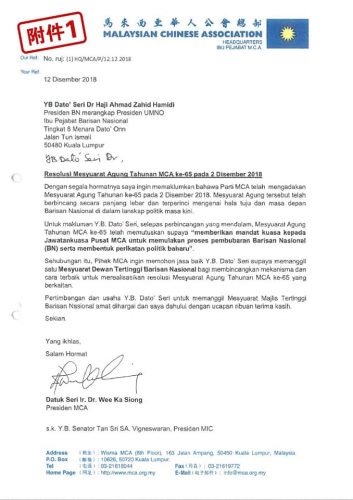 他今日在面子书出示证据透露,早在2018年12月12日致函给国阵最高理事会秘书处提呈推动解散国阵的动议。