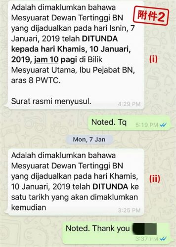 “但4日当天下午三点多,马华再次接到短信通知,国阵最高理事会议将展延至1月10日上午10时召开;2019年1月7日下午,国阵秘书处又通过发短信方式,通知国阵最高理事会无期限展延。”