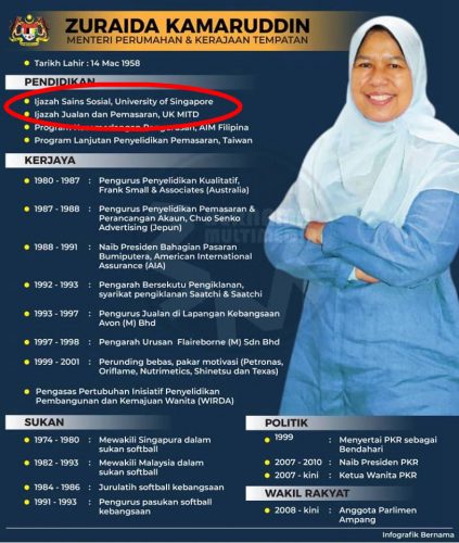 国家官方新闻社马新社在509大选后新内阁成员背景介绍图,列名祖莱达是毕业于NUS。
