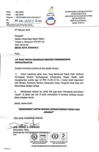 这封标题为“只给设施发展部长使用的特别电梯”公函是由沙巴设施发展部秘书伊斯迈查尔斯于今年2月7日发出。