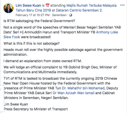林芮光日前在其面子书投诉,国营电视台(RTM)内部有人蓄意“搞破坏”,在全国新春大团拜时只直播首相敦马哈迪的致词,但没有直播交通部长及森州大臣致词,更要求RTM作出解释。