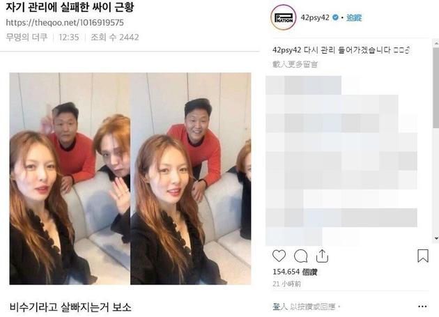 而PSY本人也转发这张照片到社群网站,笑说“我会重新管理起来的”,笑翻一堆网友。网友们纷纷表示:“这样下去会变成元斌,别再瘦啦”、“PSY为什么像小孩一样,好可爱”。