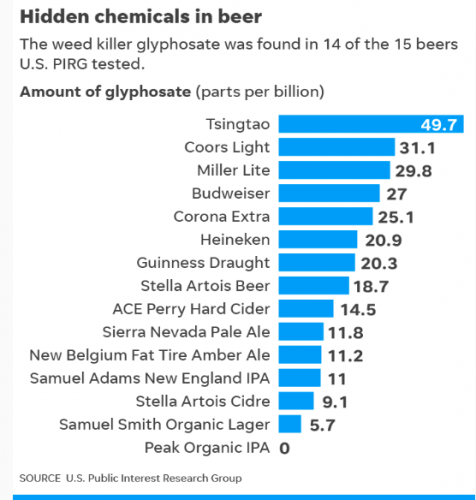 研究显示青岛啤酒含有最高的草甘膦(49.7ppb)、Budweiser含有27ppb、Heineken含有20.9ppb,Guinness Draught含有20.3ppb。