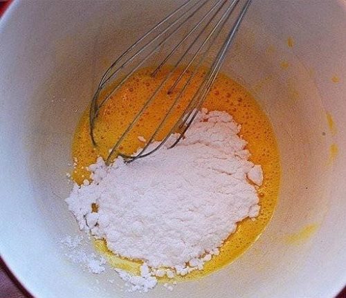 1.将蛋液和蛋黄液倒入,加细砂糖和盐一起搅拌均匀。