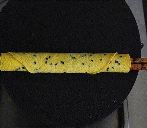 6.放入面糊后,迅速阖上蛋卷模,两面小火烘焙至熟。
