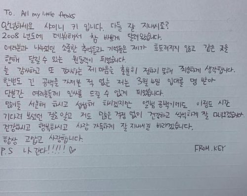 SHINee成员Key在社交网站公开了入伍剃发照与亲笔信。照片中,Key穿灰色卫衣出镜,头发剪成超短板寸,但依然十分帅气。