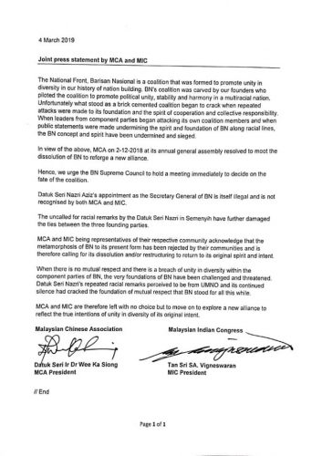 马华公会和印度国大党作为各自族群的代表政党,认知到如今的国阵已经变质,也被我们所代表的族群所拒绝。因此,我们推动解散及/或重组,以回归原有的精神和初衷。