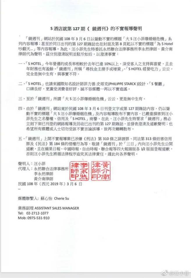接着晚上,汪小菲又发文向大家喊话:“台北的朋友们都是非常热情和阳光的,千万别因为个别媒体坏了这里朋友们在大陆的形象。”随文还附上一张声明,表示婚变消息都是无生有,为了维护酒店权益,要求周刊下架相关新闻以及回收已出刊杂志,且在3日内向汪小菲公开道歉,并于四大报头版登报道歉,否则将采取法律程序追究责任。