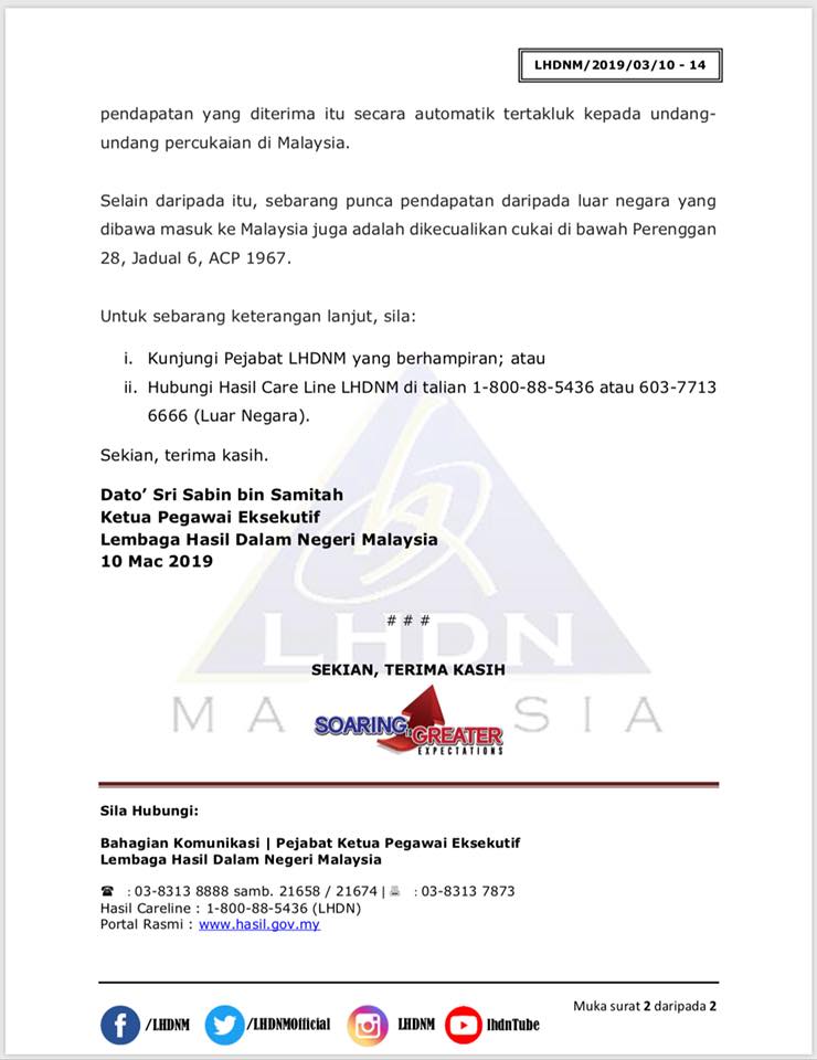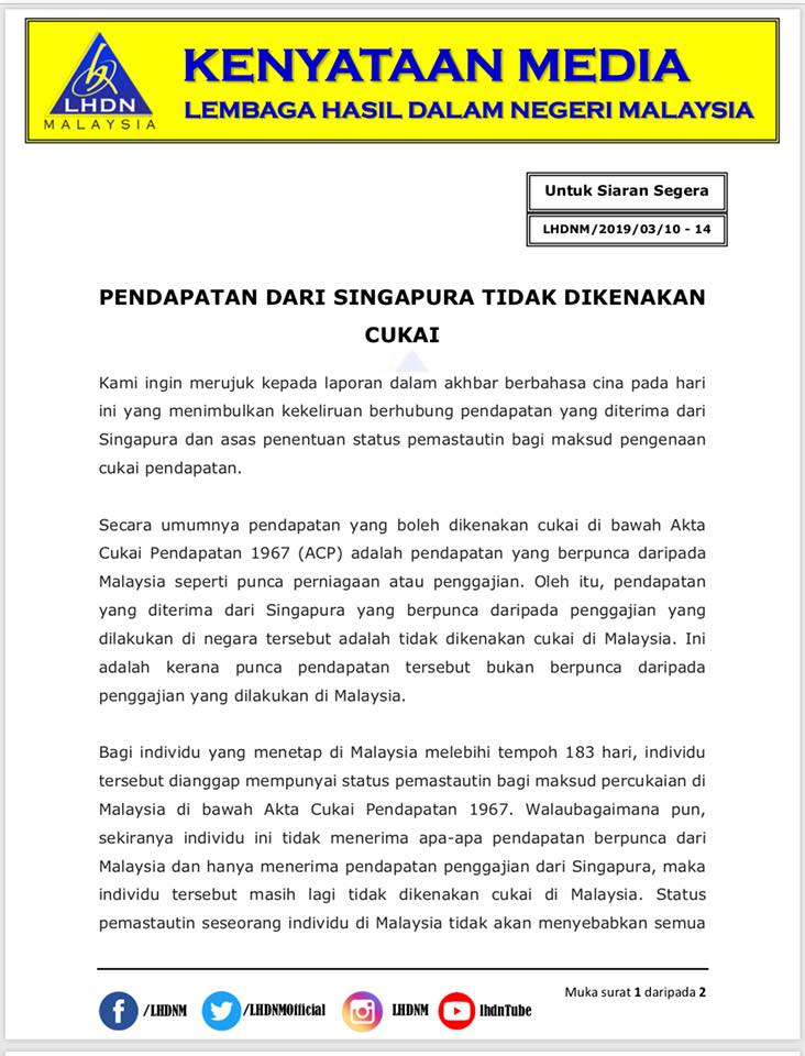 內陸稅收局(LHDN)首席执行员沙宾发表文告指出,根据1967年所得税法令,只有在大马工作和从商的国人,所领取的收入需缴税给内陆税收局,反之在外国工作所领取的收入则无需报税。