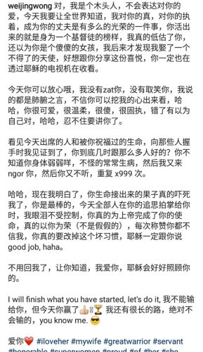 黄伟津昨晚在个人面子书上载两人的甜蜜结婚照,并配长文写出对江倩龄的思念与爱:“今天我要让全世界知道,我对你的真,对你的执着,成为你的丈夫是有多么的光荣的一件事”,文中也提到两人的有趣互动点滴,最后黄伟津承诺好好生活向天上的妻子喊话“我不能输给你,但今天你赢了,我还有很长的路,绝对不会输的”。