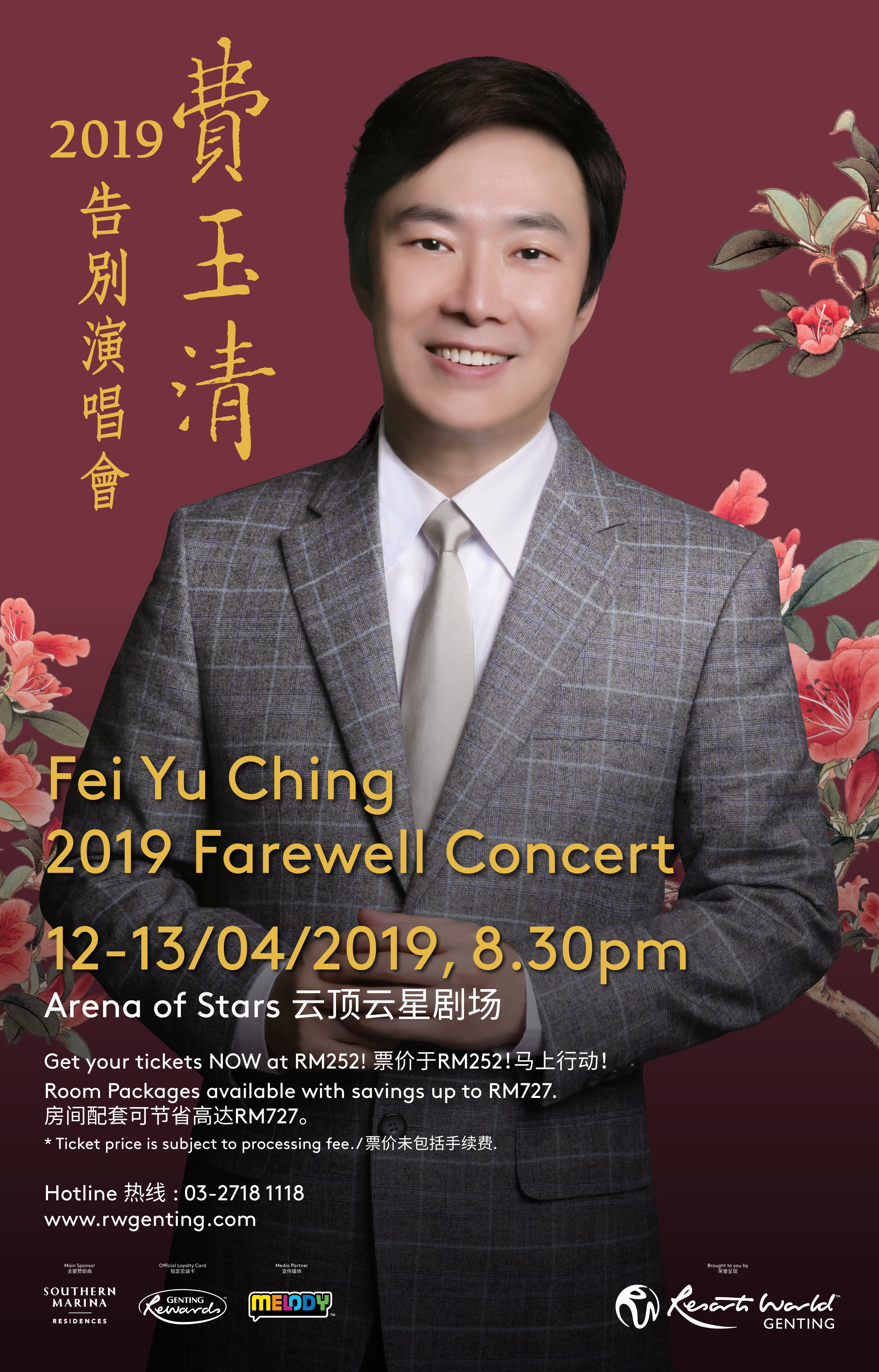 《费玉清2019告别演唱会》将于2019年4月12日和13日进行,12日的门票价格分别为656令吉(PS1)、476令吉(PS2)、342令吉(PS3)和252令吉(PS4),而13日的门票价格分别为728令吉(PS1)、528令吉(PS2)、380令吉(PS3)和280令吉(PS4);票价皆未包括4令吉手续费。