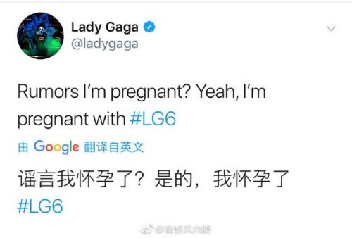 Lady Gaga回应怀孕传闻 暗示新专辑正在制作 14 Mar , 2019 | 娱乐前线 Lady Gaga发文辟谣自己怀孕的传言。 Lady Gaga发文辟谣自己怀孕的传言,表示自己怀的其实是“LG6”,暗示了第六张新专辑正在制作的消息,随后与LG6相关人员纷纷回应,包括同为制作人的Boys Noize和Diplo,编舞老师Richy,音乐总监Michael Bearden。同时,Lady Gaga的社交媒体新关注了音乐制作人Bloodpop和蕾哈娜Rihanna。 分享