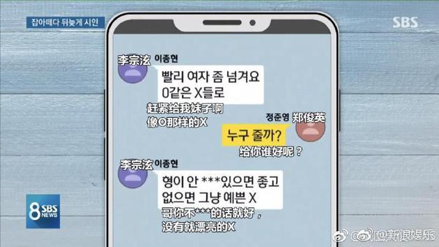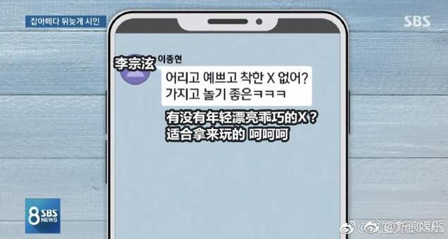 据韩国媒体报道3月14日晚,SBS八点新闻再次报道关于胜利郑俊英偷拍事件。报道中曝出李宗泫在群中与郑俊英对话的聊天记录。