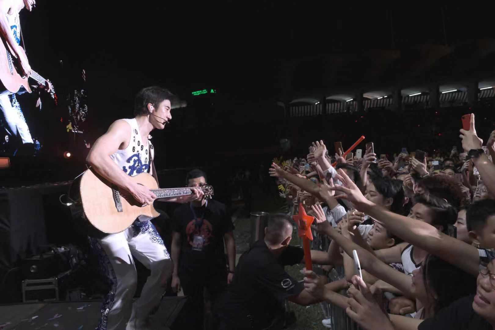 语毕,他就拿着一把吉他走到台下栏杆前,十多位保安当起人肉围墙保护他走动,并且任歌迷点歌,他演唱了《Perfect》、《唯一》、《Julia》等歌曲,演唱《漂向北方》时,他遗憾表示可惜黄明志不在现场。期间他更亲民跟歌迷握手和击掌,全场超high。