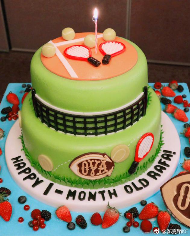 此外,桌子上放有一个两层高的生日蛋糕,蛋糕上更有网球拍等装饰,看来他们都想儿子长大像爸爸一样热爱网球!陈凯琳以英语留言:“你是我们生活中的光明和幸福,我们会做任何事情让你安全,受保护和被爱的!Happy 1-Month Old Baby Rafa!”